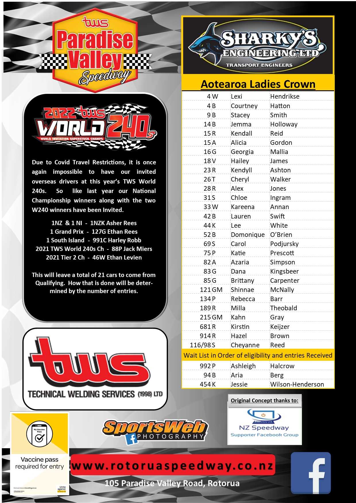 Great to see the Sharky's Engineering Aotearoa Ladies Crown is once again popular with our Ladies, and that we have a wait list to get in. The eligibility for this event is firstly open to those who competed last year, followed by competitors who raced in the 2020/21 season and then those who a new and in order of entering. As a testament to how our ladies rank this meeting, 22 of the 28 who put on such a great show last year are returning. We are sure they will one again put on a great show!!!!