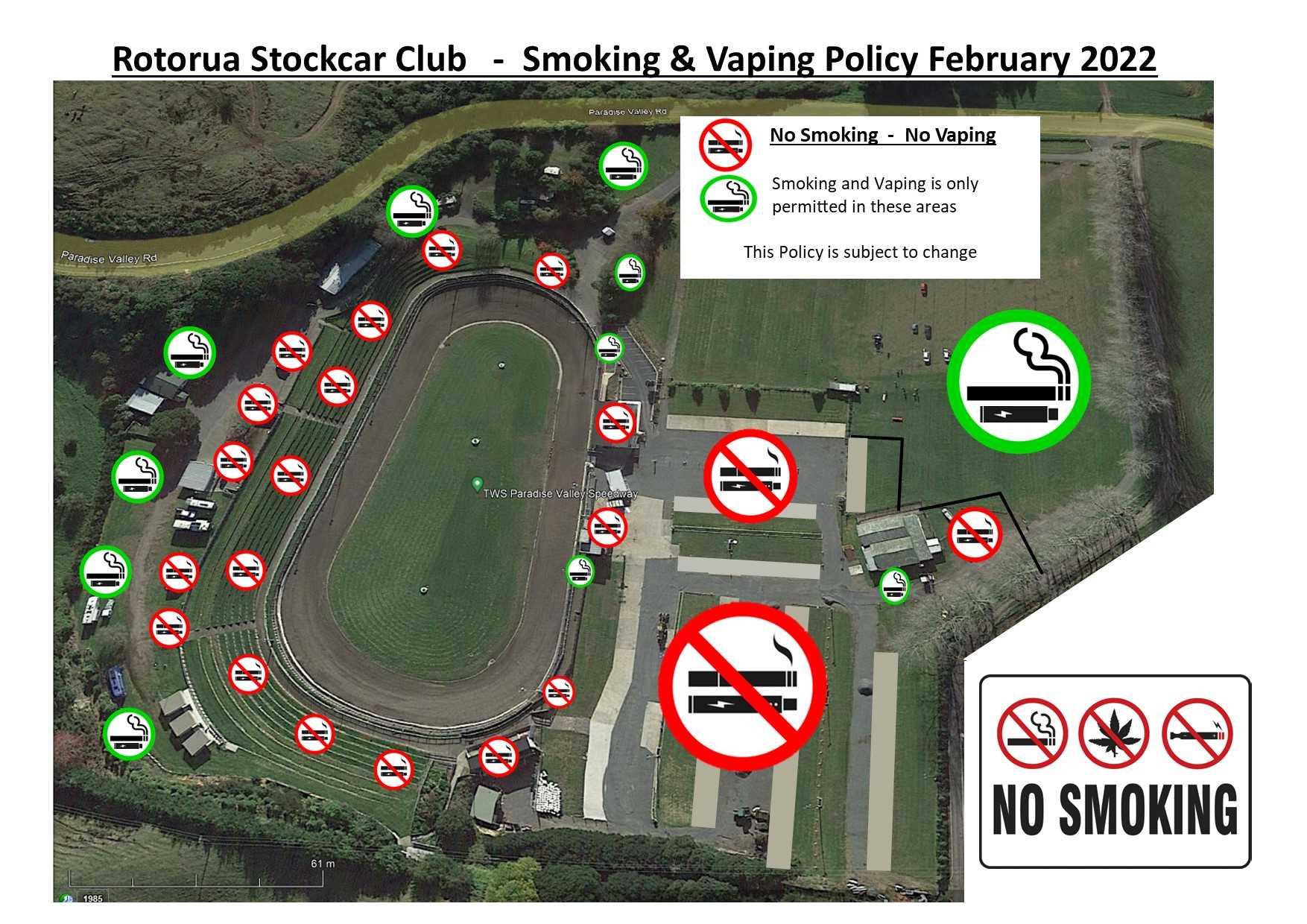The Rotorua Stockcar Club Committee has discussed the matter on many occasions but has now finally decided that when we go back racing that the Terraces and Pit Area as per the attached drawing will now be “No Smoking and No Vaping Areas”.