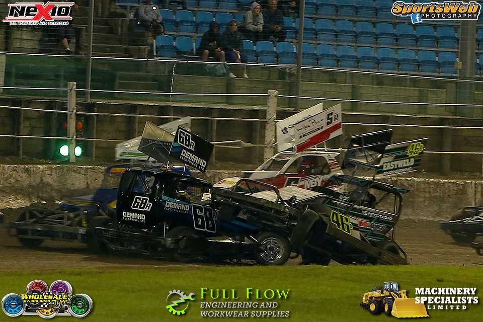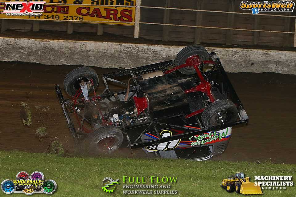 The Y Ministock group for the younger less experienced drivers was led by 98r Reeve Transom who pulled off a superb passing move late in race one to collect the win. Race 2 was won by 93r Blake Fraser while the last race was running smooth until near the end when 4r Blake Hose got tangled up with a few others and went over before sliding along on his roof then back on all fours. 972r Jimmy Crawford took the win from 64r Riley McKeown.