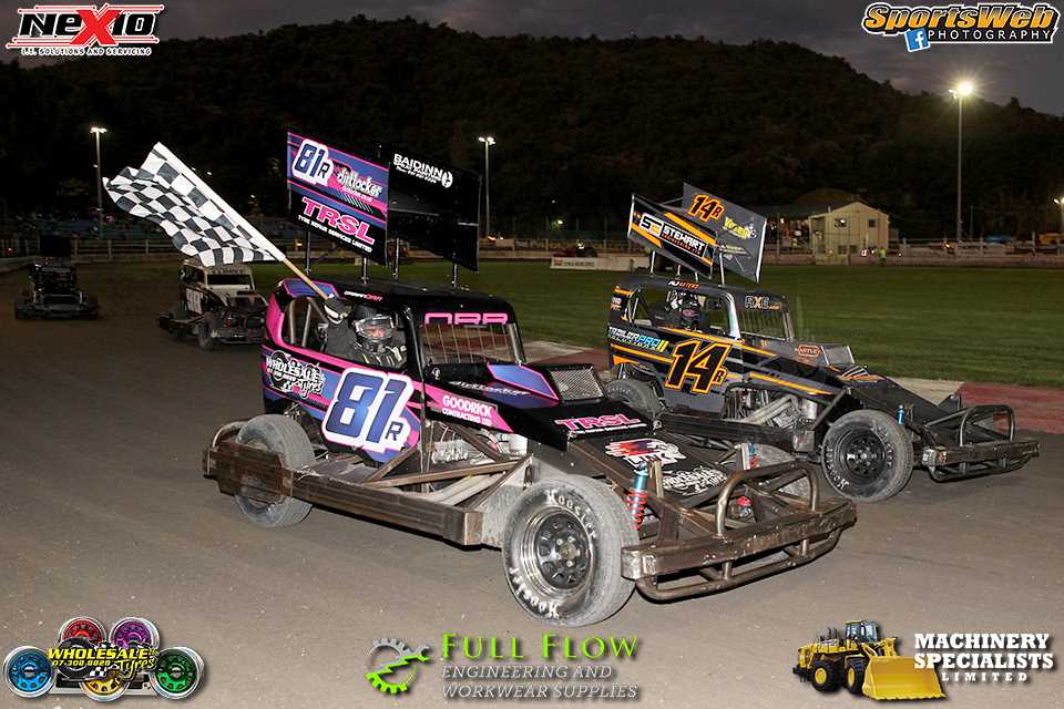 In addition to the teams races, the Superstocks had 3 open races with 26 cars on the grid for race one. A busy and dusty race 1 went to Hawkes Bay visitor 46b Quinn Ryan. Race 2 saw another good finish for the 46b of Ryan who finished second ahead of club mate 16b Brett Loveridge who run down early leader 38r Ross Ashby for the win. Race 3 went the way of 93m Mark Dunn who guided his recently acquired 6 cylinder powered tri rail car to a win and proved that 6 is enough to win.