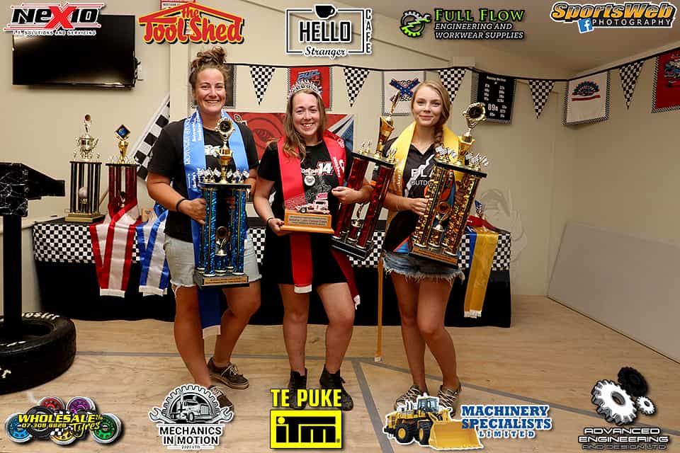 Heat 4 the Aotearoa Ladies Stockcar Crown saw 4w Lexi Hendrixe on pole and after bumper crunching race the flag carrier had a familiar look about r her with 14b Jemma Holloway coming through for the win and extending her points lead. Heat 5 saw things get a little rough with 454k Jessie Henderson dealing to a few and 15a Alicia Gordon copping a huge hit from 915r Samantha Lane. At the end it was 28r Alex Jones who cruised home to win from pole position. The sixth and final heat was pretty full on with 17a Kristin Vermeulen coming through for the win but Holloway was clever enough to avoid the contact to successfully defend her title.