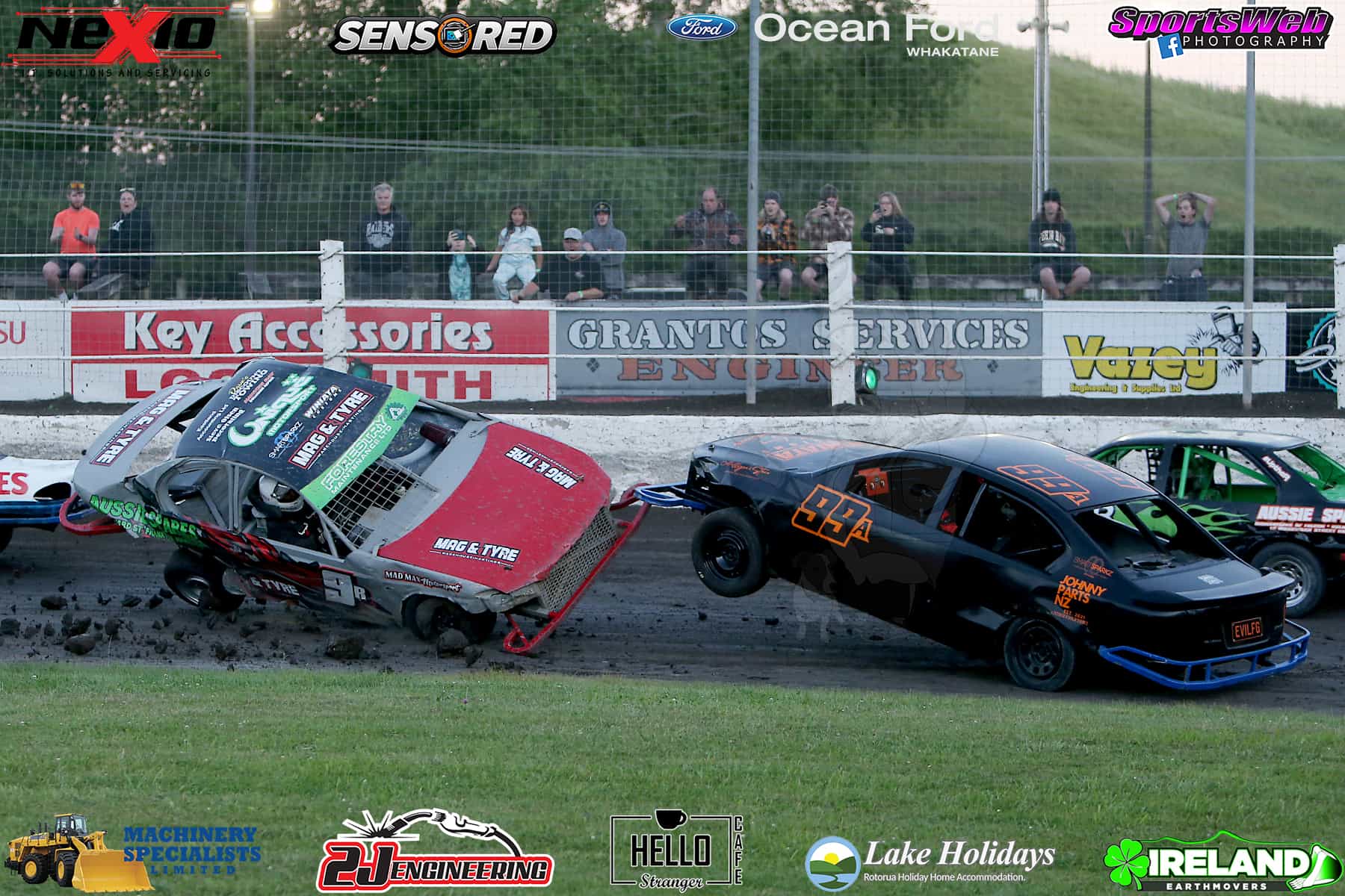 The Streetstock teams final between the Assassins and the Mag & Tyre Select was a doozy of battle. It was 9r McNamara who lit things up getting Williams into the walk then was almost on his lid then was sent to the infield with a flat outside tyre. Three Assassin cars went off at almost the same time which effectively ended the fight from the Aucklanders with just one car still mobile. Meanwhile up front Shane Bracken led a charmed life with 848r Richard Bracken watching his bumper all the way to the flag and first place overall.