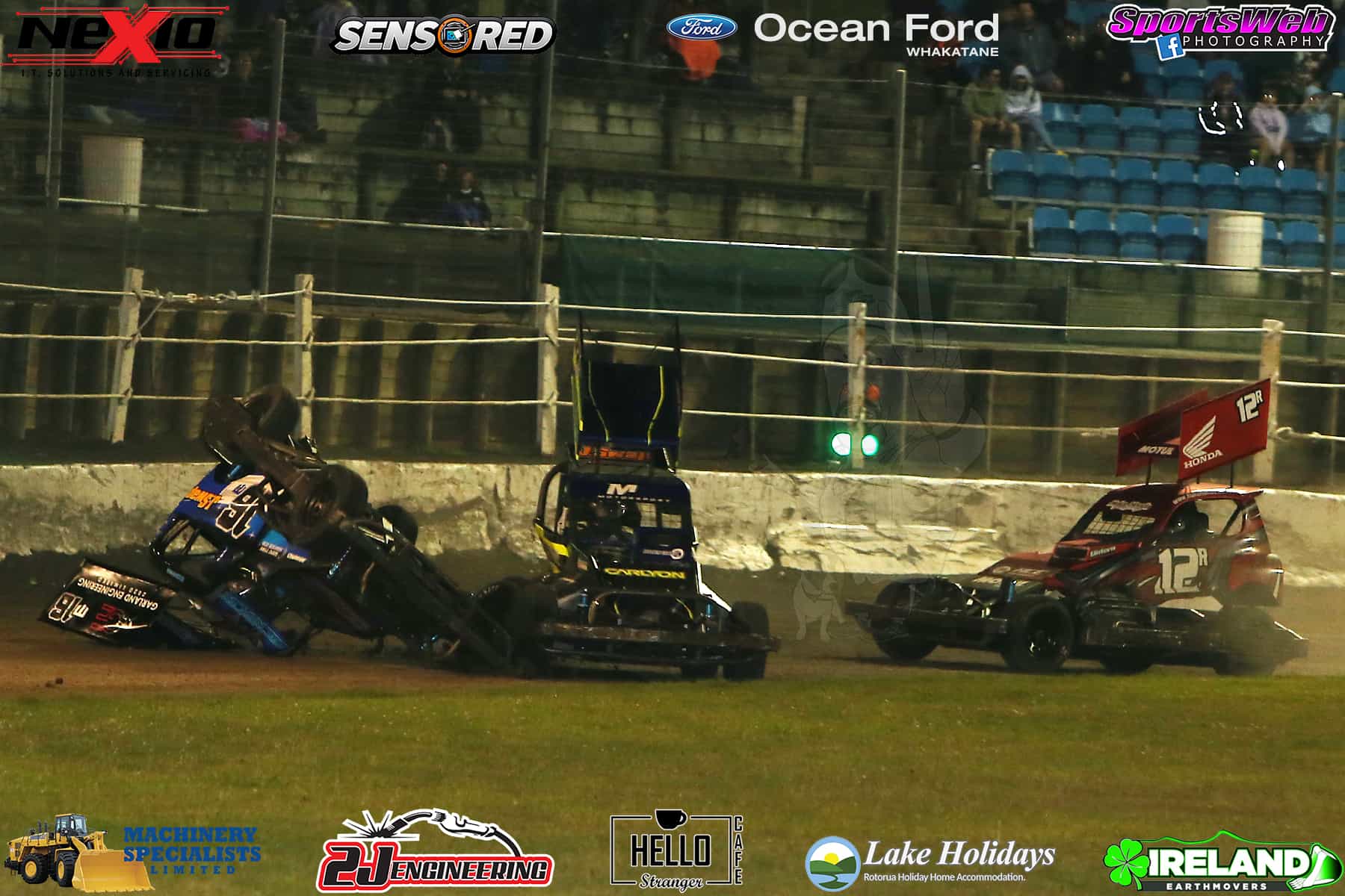 The 17 lap Superstock feature with $2k for the winner saw an all Baypark from row with team mates Hemingway and Alderdice earning those spots via their heat placings. It was frantic from the start with Alderdice in the wall hard and 5 r Logan Nicholson-Mabey also carnaged by many after getting spun. After the restart it was another red light for 16m Kyle Benton who got all out of shape and rolled. Early race leader Hemingway was held up by Stewart and walled by 95r Daryl Williams as McRobbie took the lead. There was many a battle as the laps passed by and McRobbie survived a lunge by 422b Dylan Ashton who only missed taking the leader out by inches. The 10r had had some help on his way to the overall win with Rebels team mate Stewart ensuing his captain pocketed the $2k after a busy race. Second was 23r Caleb Ashton with 18m Dan Pollock home in third with just 13 of the 26 starters classified finishers.